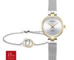 小ぶりなフェイスにあしらわれたダイヤモンドが美しい、ミニマルでクラシックなデザインの腕時計と、チャームにキュービックジルコニア&LOVEのメッセージが刻印された同配色のブレスレットを組み合わせたギフトセット。